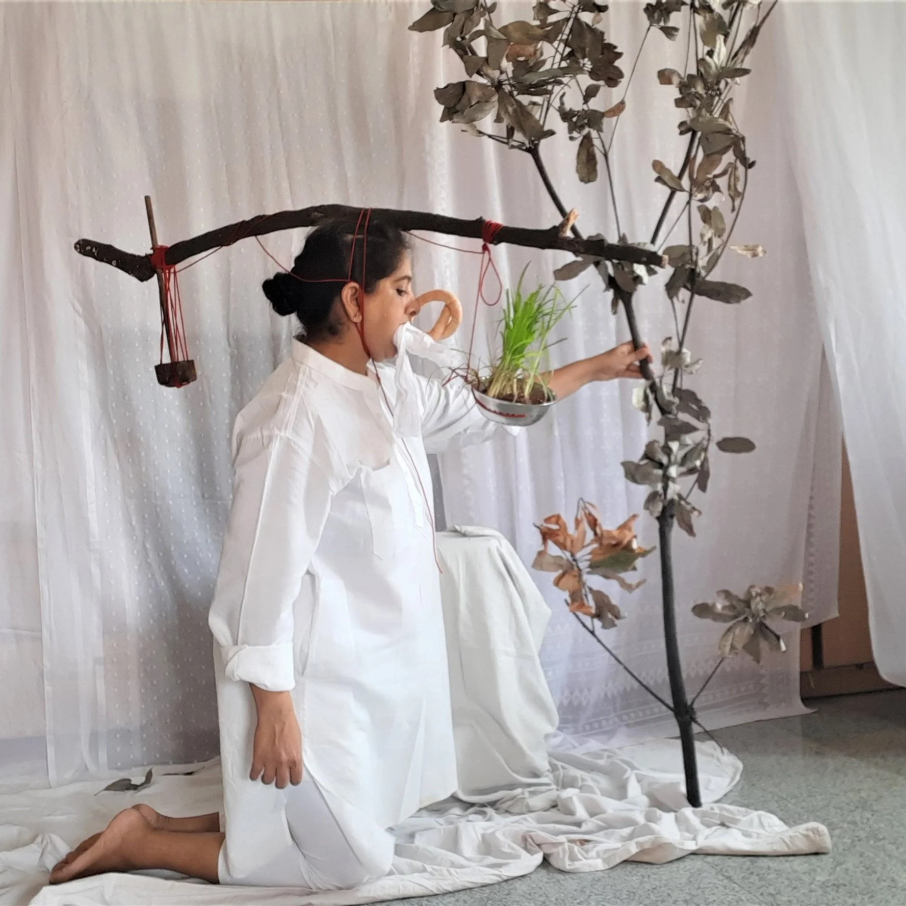 In 2020 and 2021 pandemic period she participated in festival and biennale to name few 2021, Live Performance for ADF Event French Embassy, Uncertainty Woodcut Show, Bangalore,  Live Action 16 Sweden curated by Jonas Stampe and Jaokim Stampe, Transitstation by  Dagmar I. Glausnitzer-Smith, 3rd International Yerevan Biennale, Armenia, 4th Global Be-coming Art Event-Online Event  2021   Fifth Edition of FORMA Y SUSTANCIA, 2021 R.A.W , ‘Beyond Belfast’  2021  Performed at event like  PEPA- Pequeño Evento de Performance Art curated  by   Veronica Pena and Analía Beltrán i Janés. ‘Virtual Matters’ for Hive Art Community, USA, 2021, Crossover 2020/21 Curated by Qing Cia, 2021/20-Becoming Tree 3rd Global Performance Event United Kingdom, 4th Homar Festival of Light and Out of Site Chicago event. 2020- OBLAK Performance Event, Lock Unlock simultaneous performance event2020/21. Performance at Anant Art Gallery 2020, Bio-Network Festival In 2022 her video work is part of ‘The Wrong Biennale’ curated Rajib Bhattacharya. She is practicing Live Performance art since last 20 years currently she is focusing on developing printmaking and Live Performance Art along with community based performances projects.